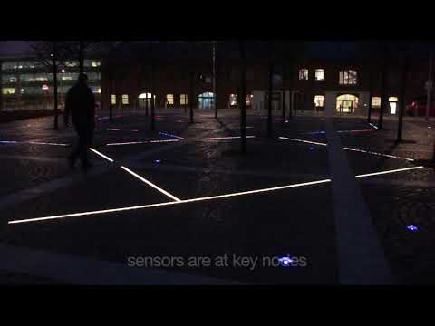 The Ice square forms a new central public realm in SA1 – Swansea’s Dockland regeneration area as well as a landing space for the Wilkinson Eyre pedestrian Bridge. The lighting installation is interactive through a grid of infrared movement sensors reacting to people’s movement. The sensors are designed to pick up the direction of their movement or enclose them in 'rooms of light' when stationary. When not trigged the installation pulses with wave of light flowing slowly across the square.